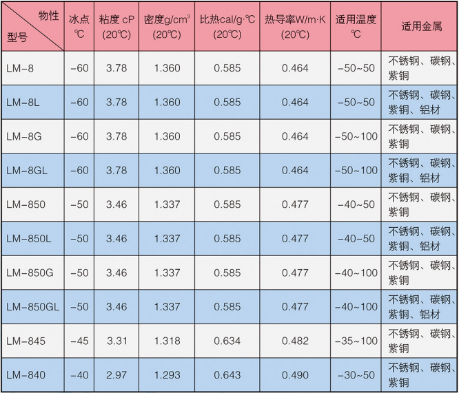 LM-8系列冰河冷媒由改性有機(jī)酸鹽構(gòu)成,主要添加劑包括防腐蝕劑,防霉劑,增溶劑,穩(wěn)定劑等。外觀為淺色液體,沸點(diǎn)高于105℃,不易揮發(fā),無(wú)閃點(diǎn),不可燃,低毒。
