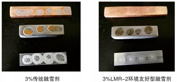 3、防腐蝕性能好,采用M3超膜防銹技術(shù),對碳鋼、銅、鋁合金等金屬幾乎不腐蝕:對瀝青、混凝土路面腐蝕較小。LMR-2融雪劑防銹性能見下圖。