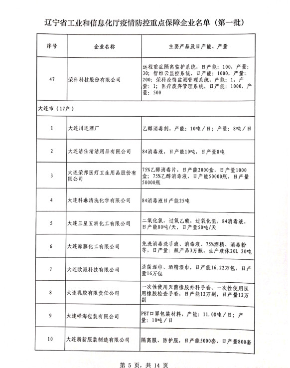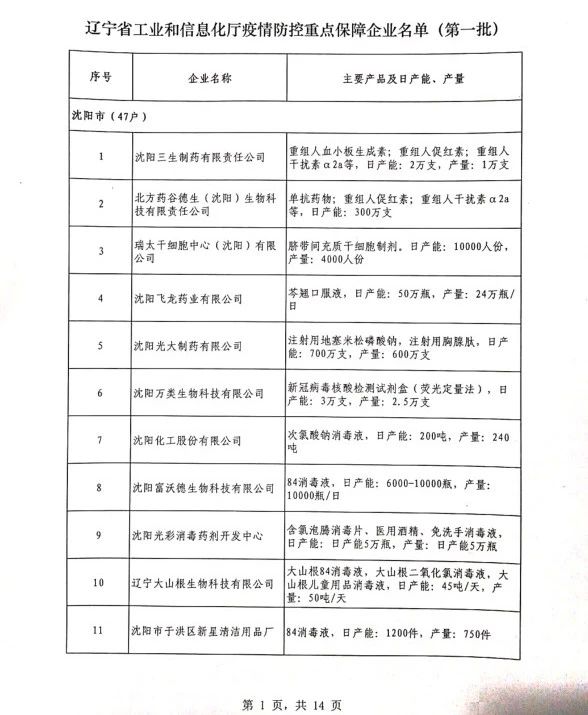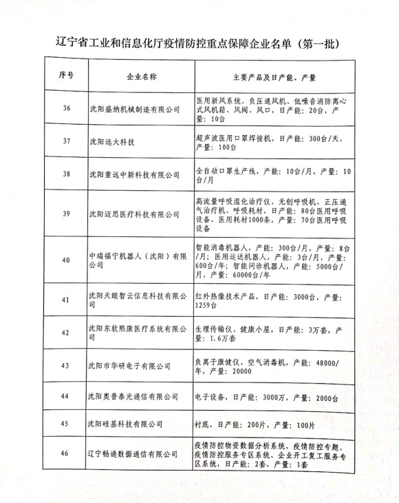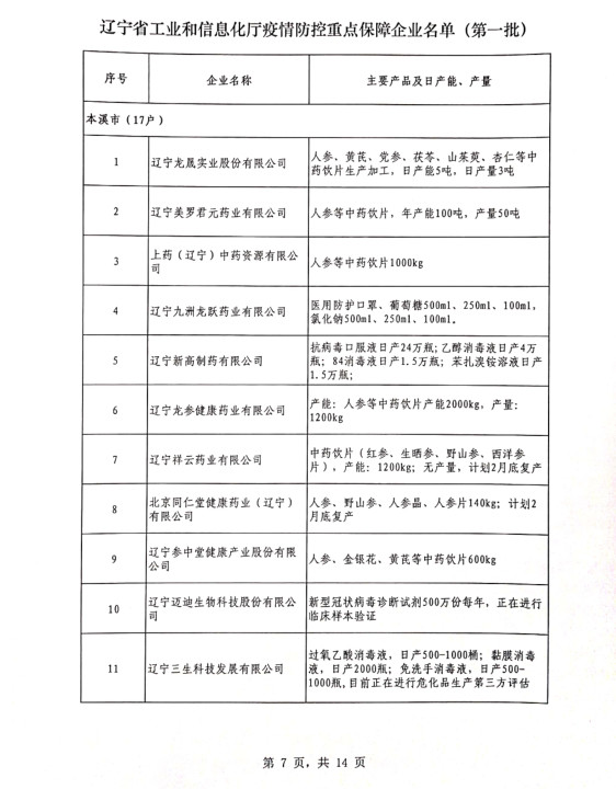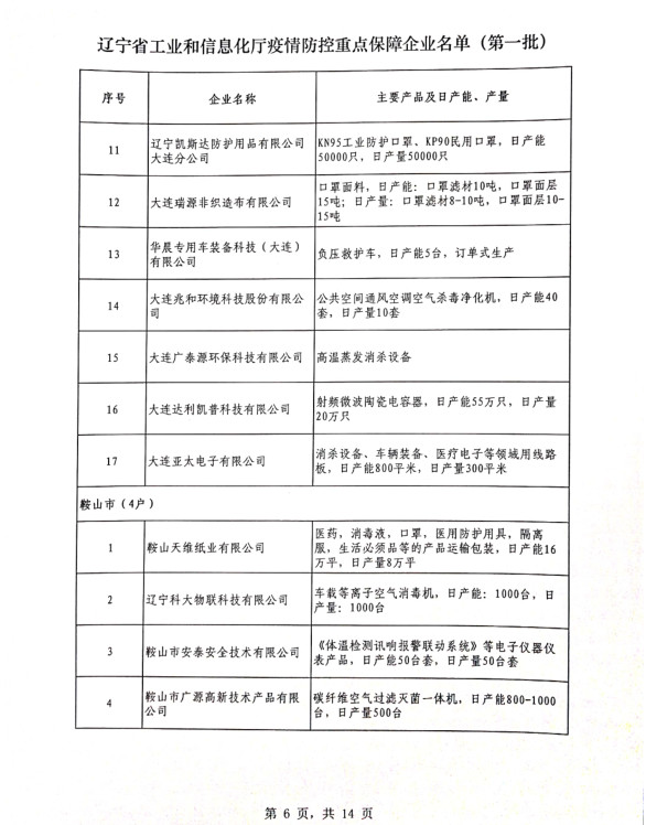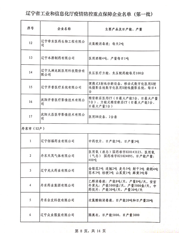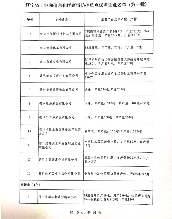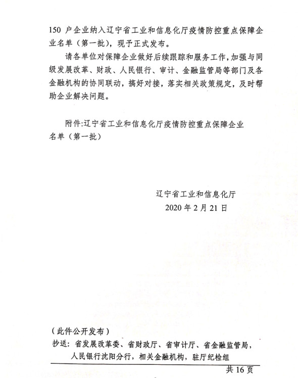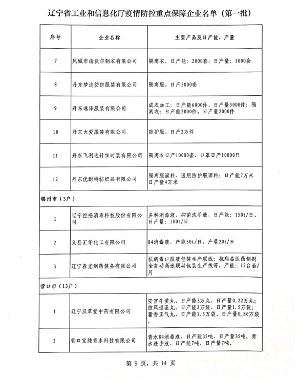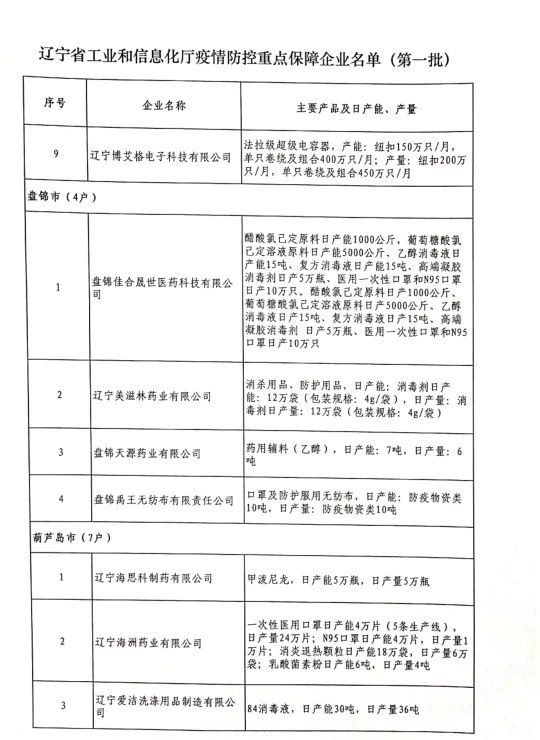 為貫徹落實習(xí)近平總書記關(guān)于疫情防控工作的重要講話和指示批示精神,落實黨中央、國務(wù)院和省委、省政府有關(guān)部署,按照《遼寧省人民政府關(guān)于印發(fā)遼寧省應(yīng)對新型冠狀病毒感染的肺炎疫情支持中小企業(yè)生產(chǎn)經(jīng)營若干政策措施的通知》(遼政發(fā)【2020】6號)和《遼寧省工業(yè)和信息化廳關(guān)于規(guī)范省級疫情防控重點保障企業(yè)名單管理有關(guān)事項的通知》(遼工信明電【2020】35號)要求,在各市審核推薦的基礎(chǔ)上,經(jīng)我廳認真研究,決定以下150戶企業(yè)納入遼寧省工業(yè)和信息化廳疫情防控重點保障企業(yè)名單(第一批)。